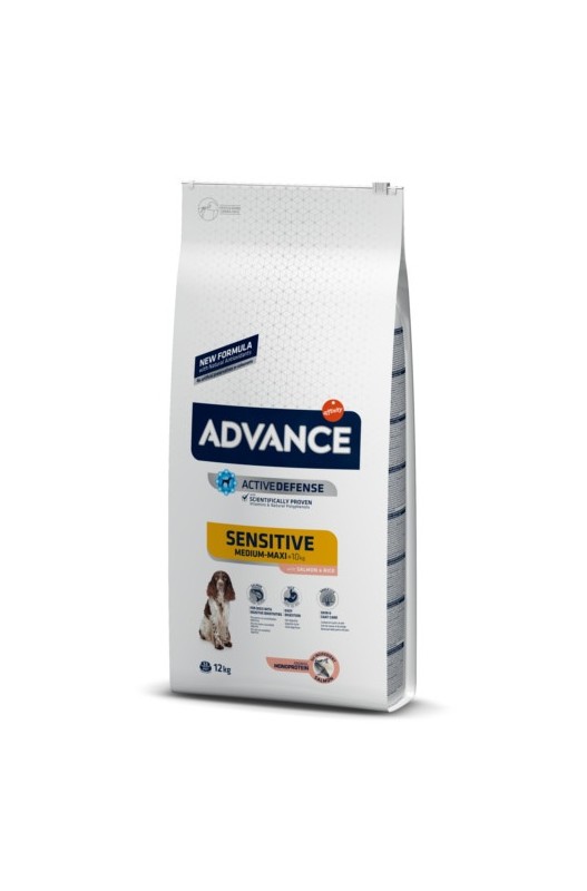 Alimento para perros con intolerancia a la proteína de la carne Advance Sensitive Advance Sensitive para perros es un pienso de alta gama especialmente indicado para animales adultos de todas las razas con intolerancia a la proteína de la carne y a otros ingredientes asociados frecuentemente a sensibilidad alimentaria. Esta calidad del pienso para evitar intolerancias a ciertos alimentos se consigue gracias a la presencia del salmón como primer ingrediente en su composición, el cual también hace que sea una comida rica al paladar. Este alimento contiene únicamente proteínas de pescado que favorecen la digestión de tu perro si sufre sensibilidad digestiva y ayuda a mantener su salud intestinal. Además, el pescado es rico en omega 3 y 6 que mejoran la salud de la piel y el pelaje. Su alto contenido en arroz es una fuente de carbohidratos de fácil asimilación. El pienso Advance Sensitive incorpora vitamina E para mejorar el sistema inmunitario de tu mascota. Esta vitamina, junto con la presencia de polifenoles, ayuda a retrasar el envejecimiento celular. También es un pienso que favorece la protección dental ya que al incluir pirofosfatos previene la formación de sarro en tu mascota y le aporta buen aliento. USO Y ESPECIFICACIONES: Comida para perros de todas las razas con intolerancia a la proteína de la carne y a otros ingredientes asociados a la sensibilidad alimentaria. Descripción nutricional: Ingredientes: Salmón (18%), maíz, harina de gluten de maíz, arroz (14%), proteínas deshidratadas de salmón, grasa animal, hidrolizado de proteínas, levadura, pulpa de remolacha, harina de colza, fibra vegetal, cloruro potásico, carbonato de calcio, fructooligosacáridos, difosfato de tetrasodio, sal, polifenoles naturales. Componentes analíticos: Proteína (27,0%), Contenido de Grasa (18,0%), Fibras Brutas (2,0%), Materia Inorgánica (7,0%), Calcio (1,3%), Fósforo (0,9%), Humedad (9,0%). Aditivos: Vitamina A (27000 IU), Vitamina D3 (1800 IU), Vitamina E (670 mg), Vitamina C (Sal de sodio y calcio del monosfosfato ascórbico) (500 mg), Taurina (1200 mg), Sulfato férrico monohidratado (260 mg) (Fe: 85 mg), Yoduro de potasio (1,9 mg) (I: 1,4 mg), Sulfato de cobre pentahidratado 34 mg (Cu: 8,8 mg), Sulfato manganoso monohidratado (124 mg) (Mn: 40 mg), Sulfato de zinc monohidratado (395 mg) (Zn: 144 mg), Selenito sódico (0,24 mg) (Se: 0,11 mg). Con antioxidantes.