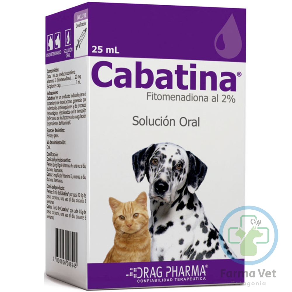 Cabatina® Solución Oral del laboratorio chileno Drag Pharma, es un antihemorrágico de acción específica. Su principio activo, la Vitamina K1 (Fitomenadiona), es un cofactor esencial para la síntesis de los factores de coagulación en el hígado, proceso que es bloqueado por los rodenticidas anticoagulantes.