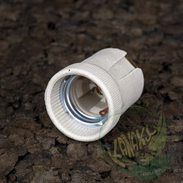 Casquillo cerámico con rosca E27 (la normal, vamos) para conectar bombillas de calor (o cualquier otro tipo). Su fabricación en porcelana blanca hace que sea resistente a las altas temperaturas que alcanzan estas bombillas.