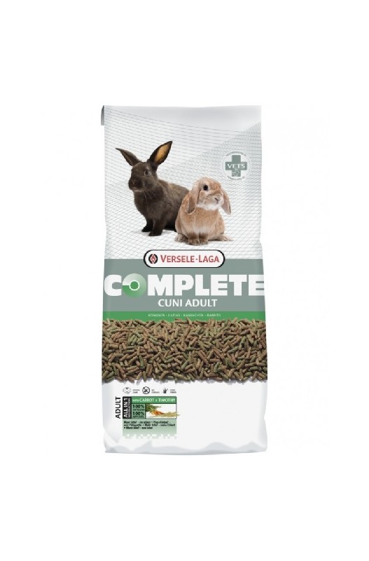 Extrusados ??todo rico en fibra para conejos adultos. Versele-Laga Complete Cuni Adult es nutrición sin preocupaciones. Los gránulos todo en uno excepcionalmente sabrosos evitan el comportamiento de alimentación selectivo. De esa manera, tu conejo obtiene todos los nutrientes esenciales y se mantiene perfectamente sano. El alimento libre de cereales con fibras largas se adapta específicamente a las necesidades nutricionales de un conejo adulto. Versele-Laga Complete Cuni adulto es desarrollado por veterinarios, basado en conocimientos científicos avanzados. Enriquecido con zanahorias y hierbas para una mejor ingestión y digestión. Ayuda a prevenir problemas en los dientes.