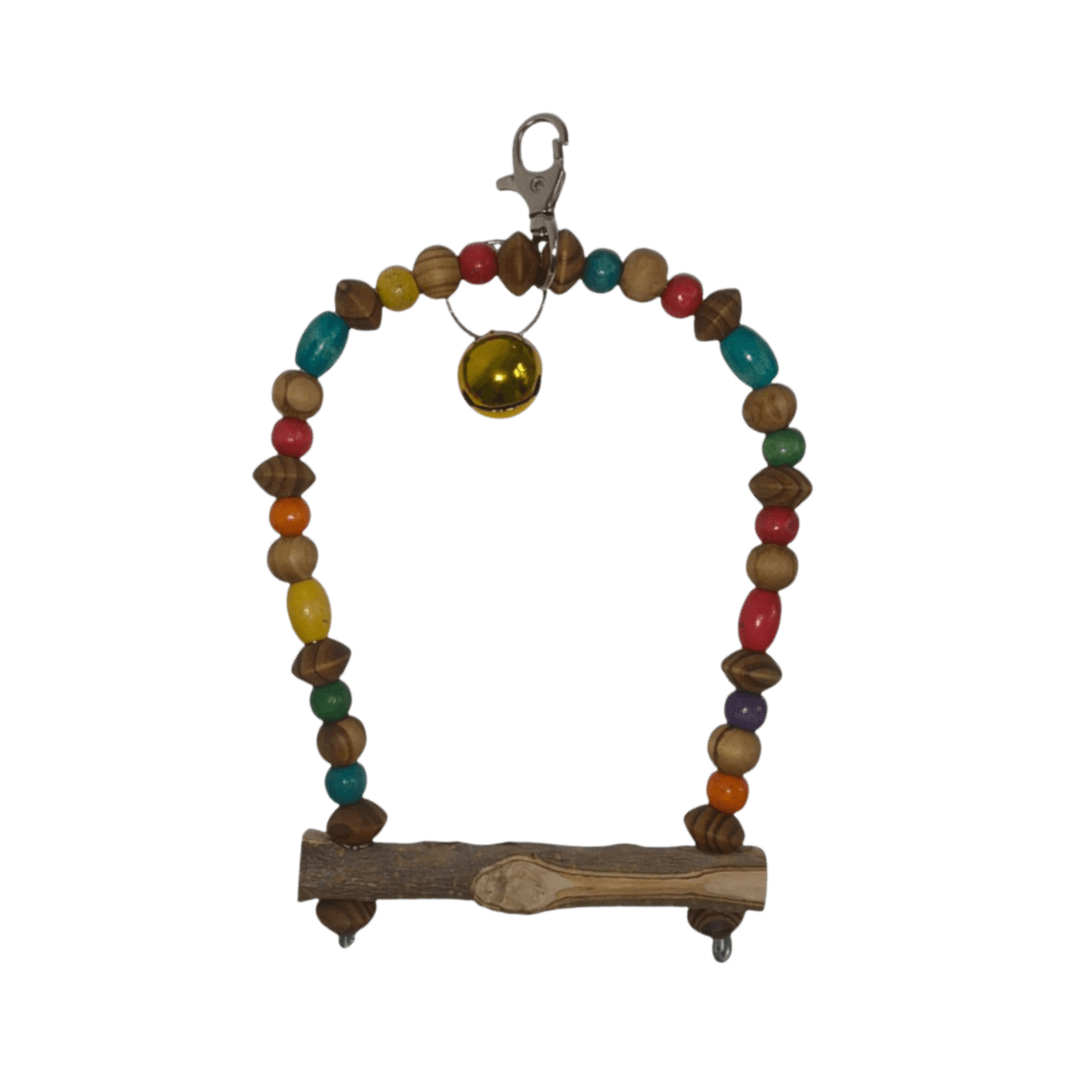 Juguete – colgante Modelo Tulum, elaborado con materiales naturales, no tóxicos; para incentivar la creatividad de las aves, evitando que caigan en la monotonía, logrando horas de diversión.