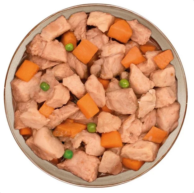 Composición: 97% cerdo fresco en su salsa, guisantes, zanahorias, boniato, especias.