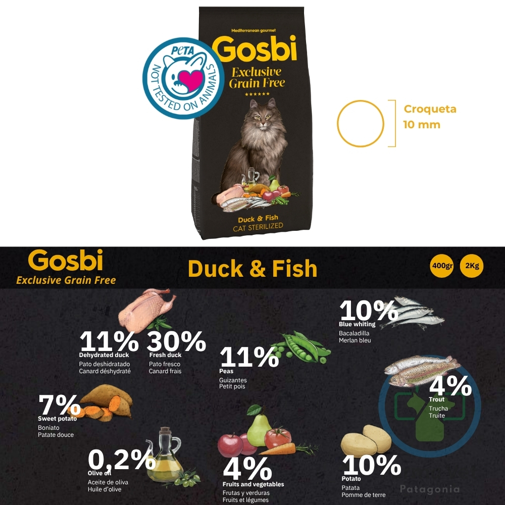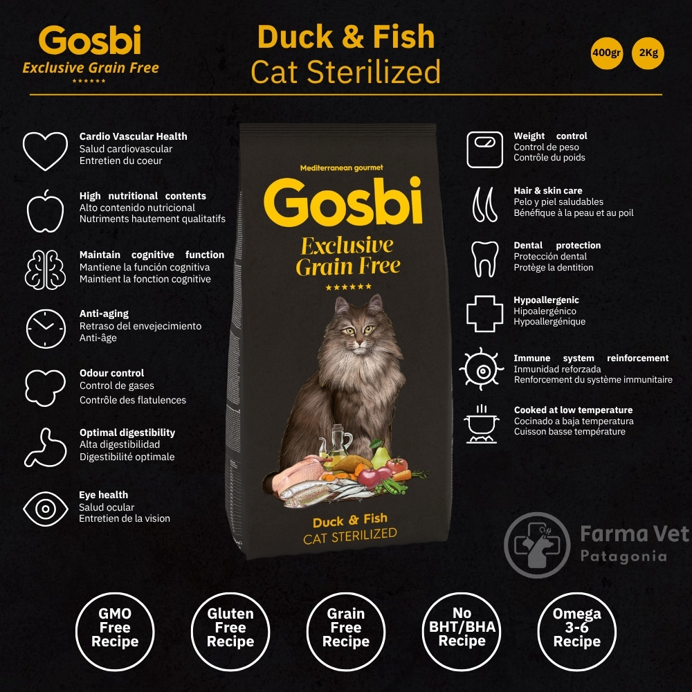 Un gato esterilizado tiene necesidades únicas que requieren una nutrición precisa. Con Gosbi Exclusive Grain Free Sterilized, le ofreces una dieta de élite que cuida su peso y protege su sistema urinario. GOSBI es estar previniendo los problemas más comunes de los gatos esterilizados, con un alimento que le encantará.
