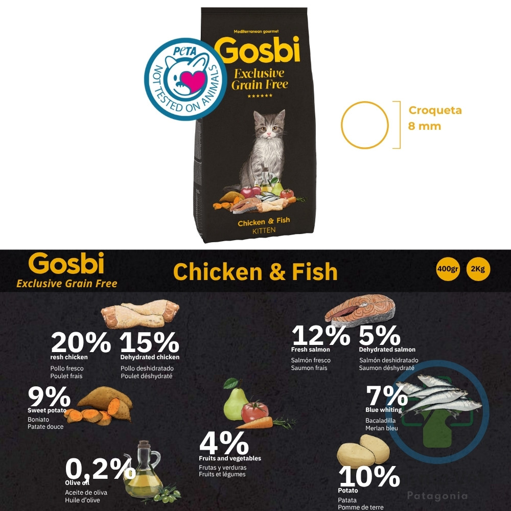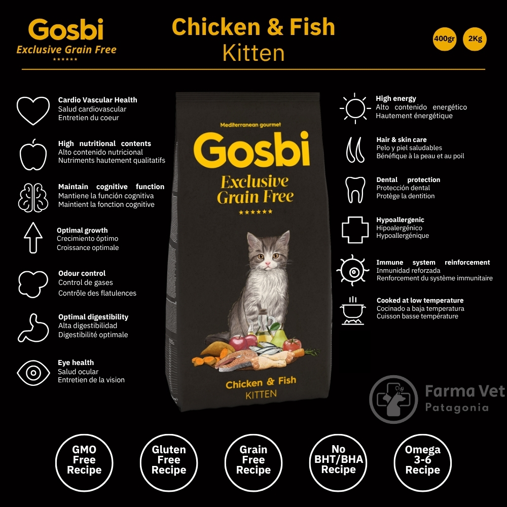 Ofrecerle a tu gatito el mejor comienzo en la vida es tu mayor prioridad. Con Gosbi Exclusive Grain Free Kitten, le proporcionas una nutrición de élite, diseñada para un crecimiento saludable y lleno de vitalidad. Es la tranquilidad de saber que cada bocado está formulado con la ciencia y la calidad que su desarrollo necesita.