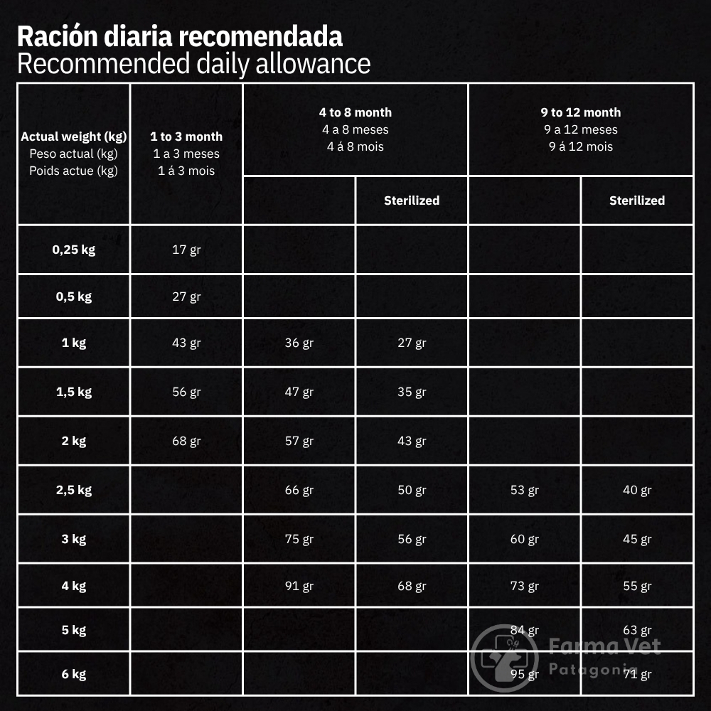 La ración diaria para un gatito varía constantemente según su edad y peso. Es crucial seguir la tabla de alimentación en el reverso del empaque y ajustarla a medida que crece, dividiendo la ración en varias comidas al día para asegurar un aporte de energía constante.