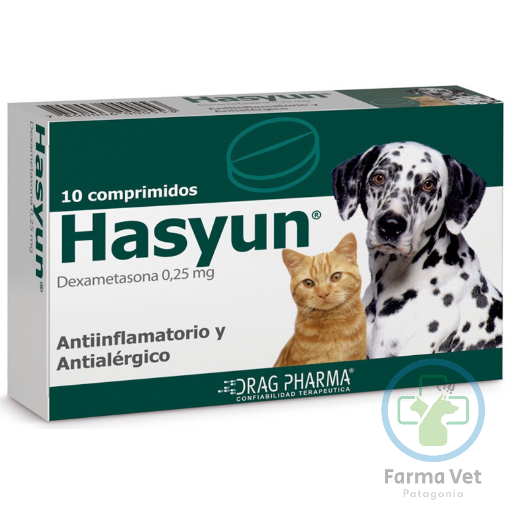 Hasyun® del laboratorio chileno Drag Pharma, es un potente antiinflamatorio y antialérgico de tipo esteroidal. Su principio activo, la Dexametasona (0,25 mg), es un corticoide que actúa eficazmente para controlar desórdenes de hipersensibilidad y procesos inflamatorios severos en mascotas.