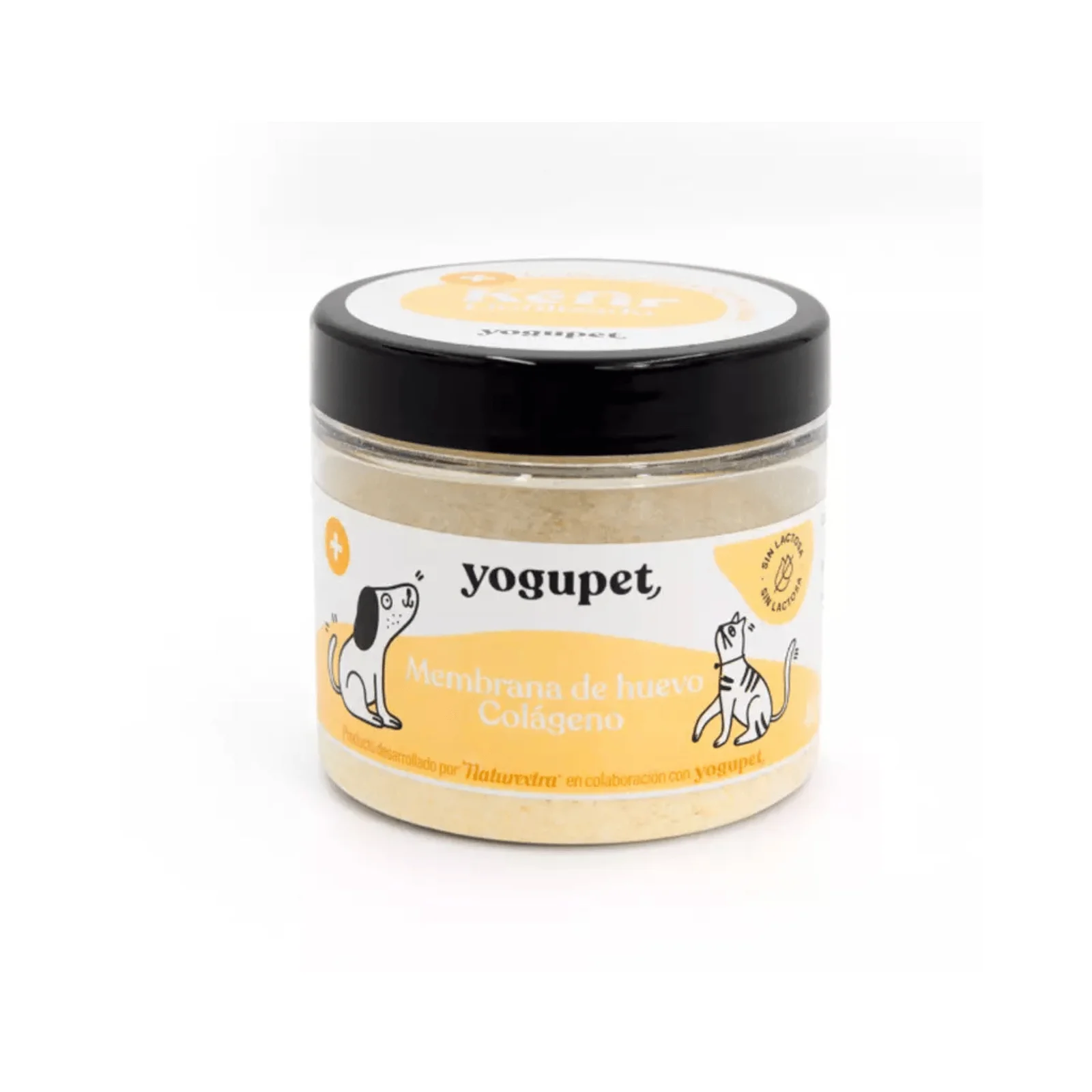 Kéfir Liofilizado Antiinflamatorio con Cúrcuma, Calabaza, Membrana de Huevo y Colágeno es un complemento natural en polvo para perros y gatos, formulado para mejorar la salud digestiva, articular y general. Elaborado con kéfir liofilizado de vaca (59,78%) rico en probióticos, calabaza liofilizada (20%) fuente de fibra y antioxidantes, colágeno porcino (0,2%) que fortalece articulaciones y piel, membrana de huevo (0,02%) con elastina y condroitina, y cúrcuma de acción antiinflamatoria. Sin lactosa y fácil de mezclar con cualquier tipo de alimento (pienso, BARF, comida casera o deshidratada), no requiere refrigeración y conserva todas sus propiedades gracias al proceso de liofilización. Formato 40 g. Análisis nutricional: proteína bruta 22%, fibra bruta 0,7%, aceites y grasas brutos 14,5%, ceniza bruta 4,3%, humedad 8,2%, calcio 0,5%, fósforo 0,5%, sodio 0,12%, lisina 0,06% y metionina 0,08%.