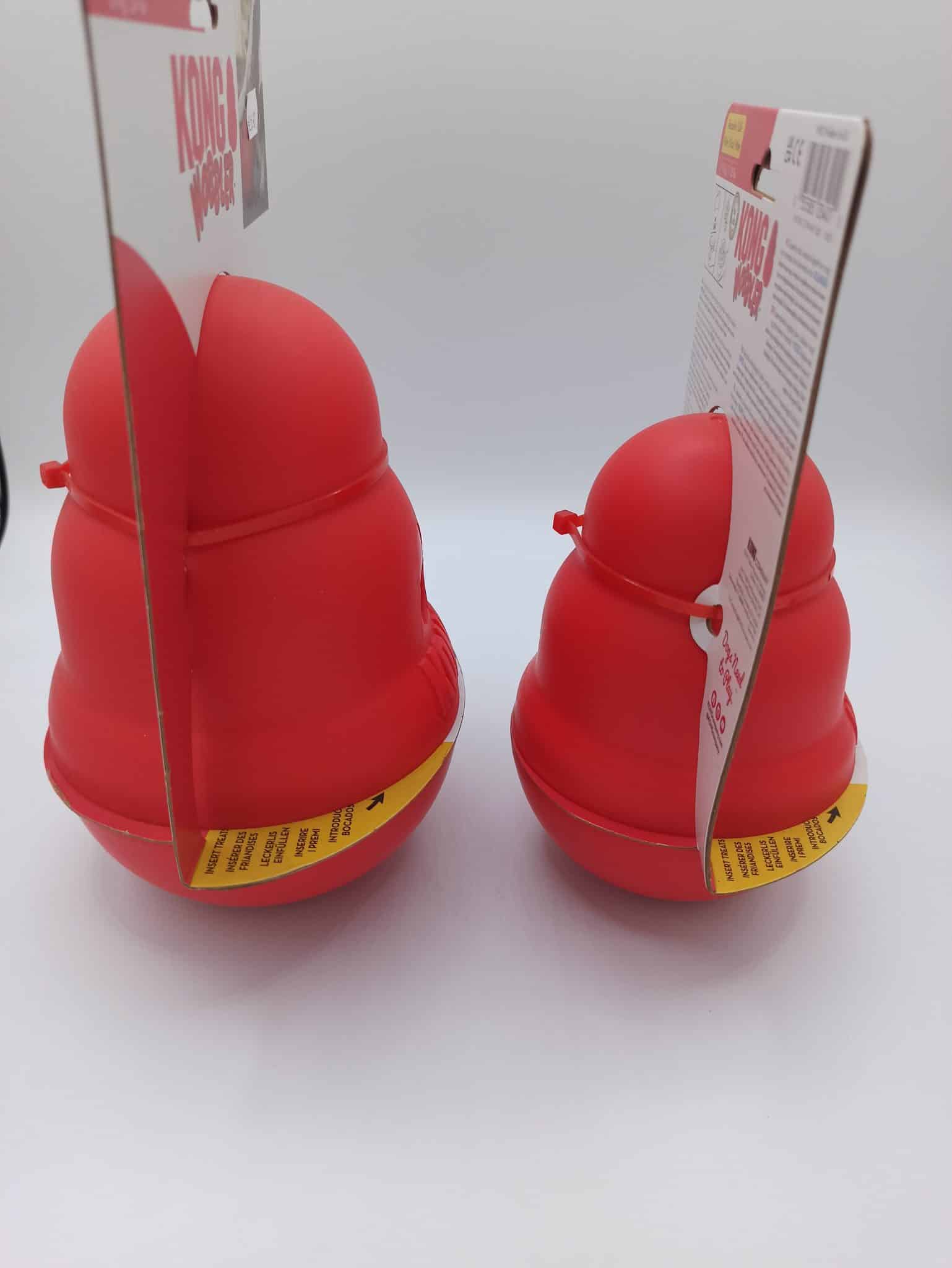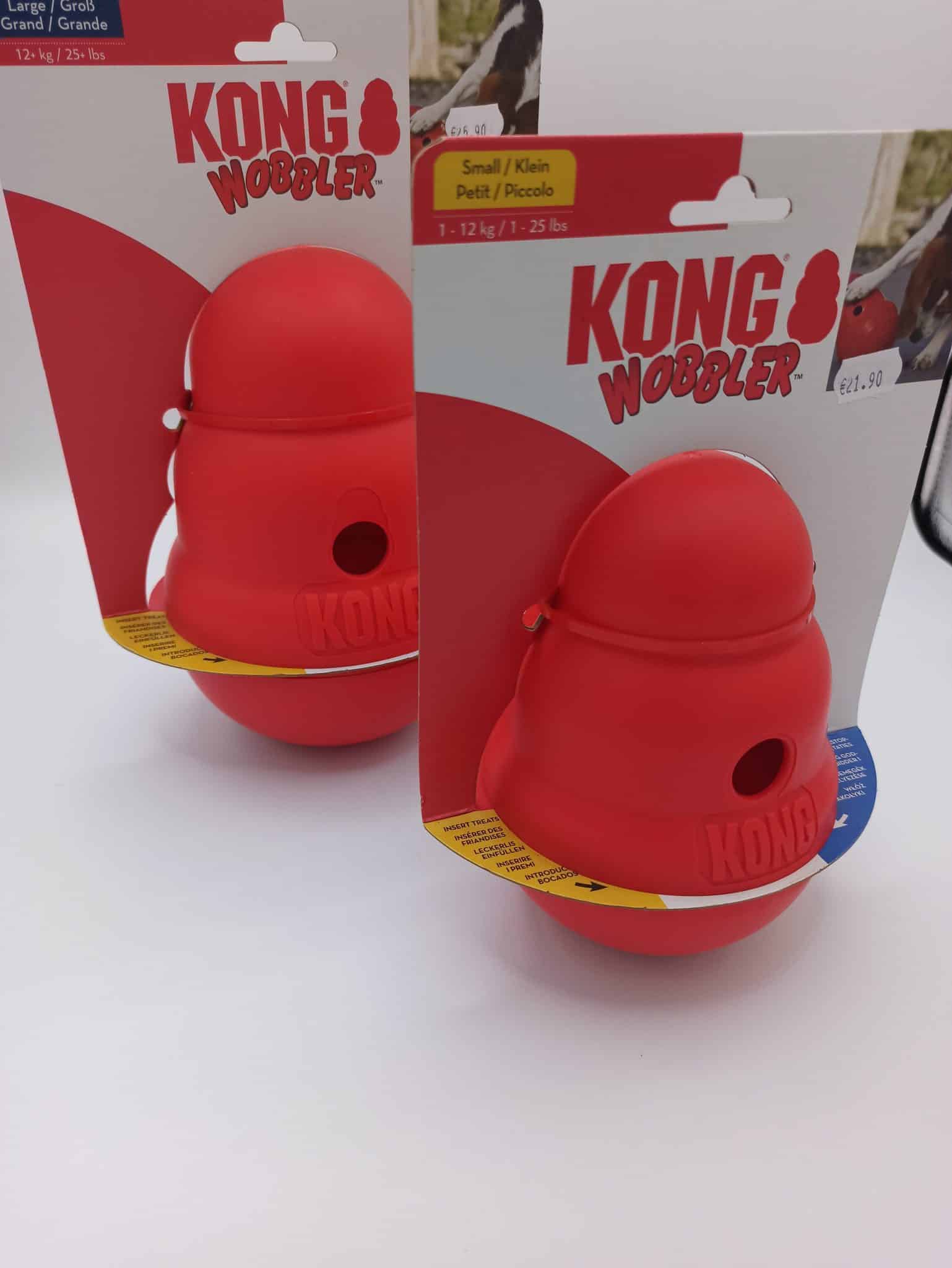 De los juguetes más divertidos es como un tentetieso como los que teníamos cuando éramos pequeños. El juego consiste en rellenarlo de premios y que tu perro los vaya sacando a través del agujero que tiene en el frontal. Como en otros juegos interactivos rellénalo estando con é para que vea el proceso, colócalo en el suelo e invítale a jugar. Por el movimiento de vaivén del Kong Wobbler puede ser que en un primer momento su perro se vea sorprendido y se muestre algo inseguro. Enséñale con tranquilidad que no hay problema e invítale de nuevo al juego. Para ello puedes tocar el jueguete y/o dejar premios en el suelo.