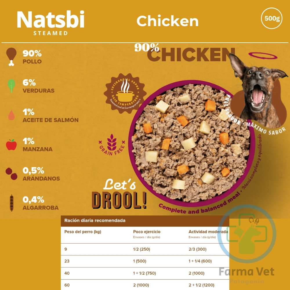 Natsbi es un alimento completo. La ración diaria recomendada depende del peso y nivel de actividad de tu perro. Consulta la tabla de alimentación en el empaque para darle la porción exacta. Puede servirse solo o mezclado con su pienso habitual para mejorar su sabor.