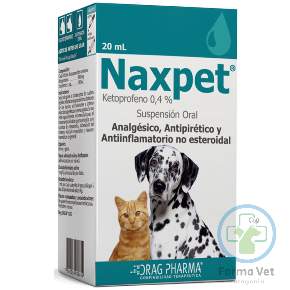 Naxpet® Suspensión Oral del laboratorio chileno Drag Pharma, es un analgésico, antipirético y antiinflamatorio no esteroidal (AINE). Su principio activo, el Ketoprofeno, actúa eficazmente para reducir la inflamación, el dolor y la fiebre en una amplia variedad de condiciones.