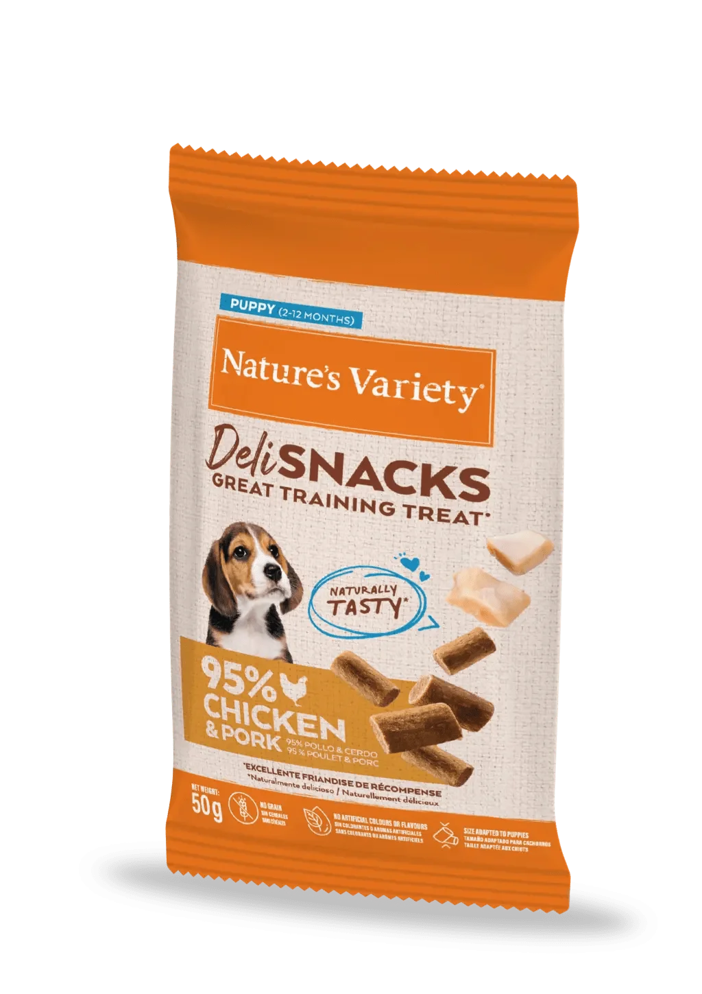 Nuestros Deli Snacks para cachorros resultan un bocado delicioso e irresistible para los perros, se elaboran con un 95% de Pollo y Cerdo, y son ideales a modo de recompensa o como un excelente premio de adiestramiento. Esta receta no contiene cereales, colorantes ni aromas artificiales.