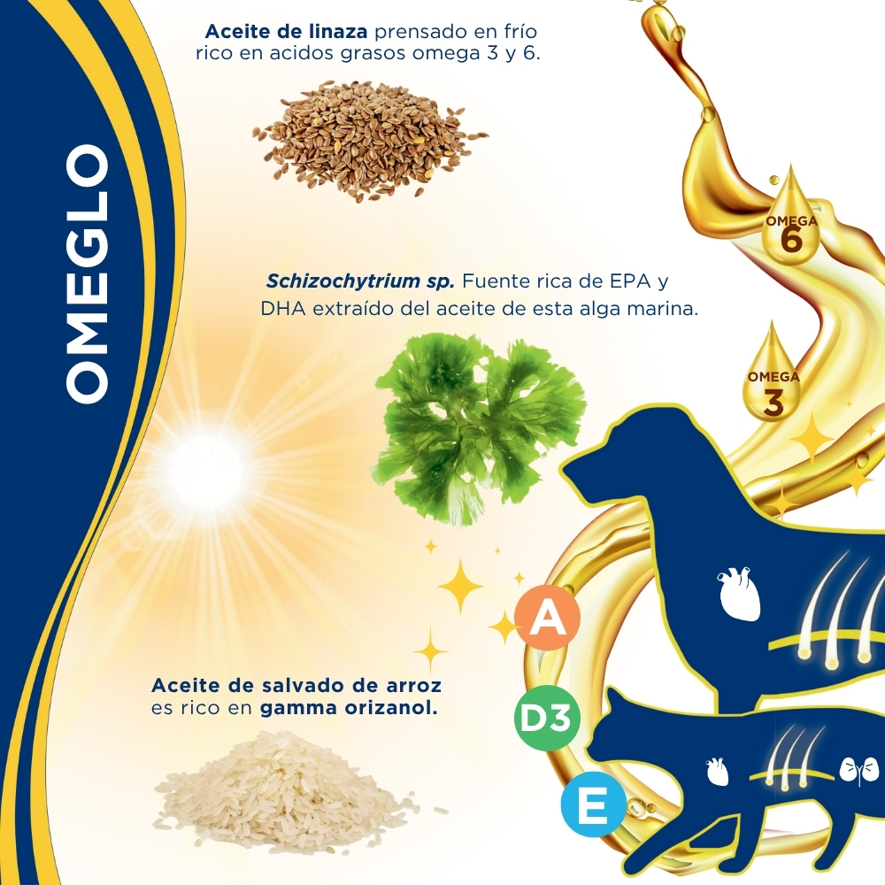Es un suplemento líquido para perros y gatos, diseñado para favorecer la función de la piel en casos de dermatosis o caída excesiva de pelo, apoyar el metabolismo articular en cuadros de osteoartritis y contribuir a la salud renal y cardíaca. Su origen vegano lo hace una opción hipoalergénica ideal.