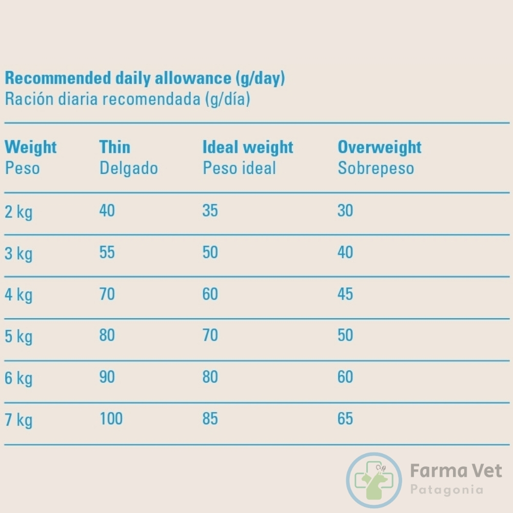 La ración diaria recomendada varía según el peso y si tu gato tiene tendencia al sobrepeso. Es fundamental consultar la tabla de alimentación en el reverso del empaque para darle la porción justa que necesita para mantenerse sano y en forma.