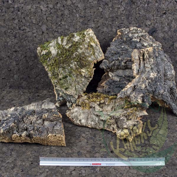 El bornizo, más conocido como corcho, es la primera capa de corteza que se le quita al alcornoque. Tiene ese aspecto rugoso irregular que tanto luce dentro de un terrario. Los paneles de bornizo natural son ligeros, resistentes al agua y tienen multitud de aplicaciones. El bornizo puede usarse para decorar paredes del terrario, usarlo como refugio para nuestros animales, o como soporte para enraizar plantas, ya que su superficie porosa retiene el agua y permite el crecimiento de raíces sobre él.