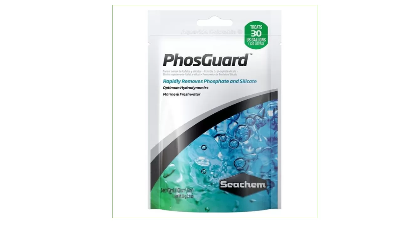 Phosguard es un producto de filtración de alta capacidad y eficiencia que elimina fosfatos y silicatos en acuarios de agua dulce o salada.no esta recomendado para acuarios de agua dulce donde sean necesarios los fosfatos.
