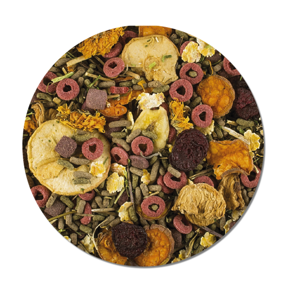 Alimento Premium Plus para Cuyos a base de granulados con alfalfa, manzana y adición de verduras, frutas secas ricas en vitaminas y hierbas aromáticas.