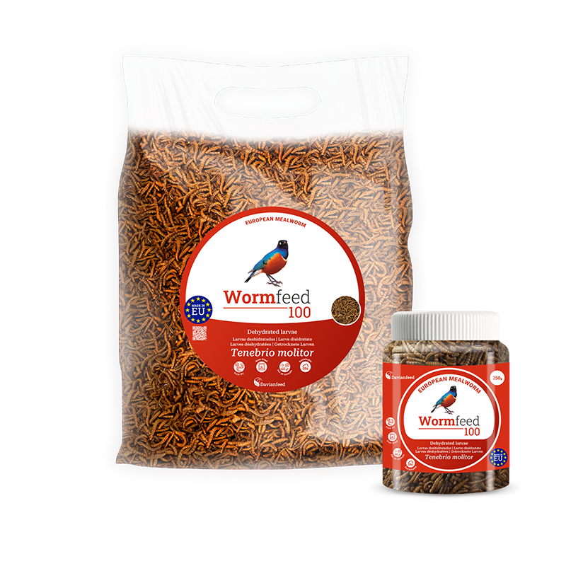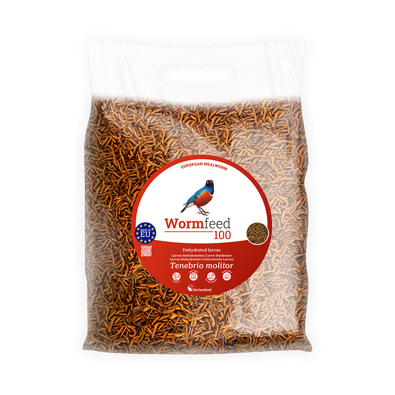 Larvas de Tenebrio molitor (gusano de la harina) criado en Europa con altos estándares de calidad y deshidratado en horno para dar como suplemento alimenticio a las aves. El proceso de deshidratación por horno favorece la integridad de la larva, mejorando su composición nutricional e incrementando su apetencia.