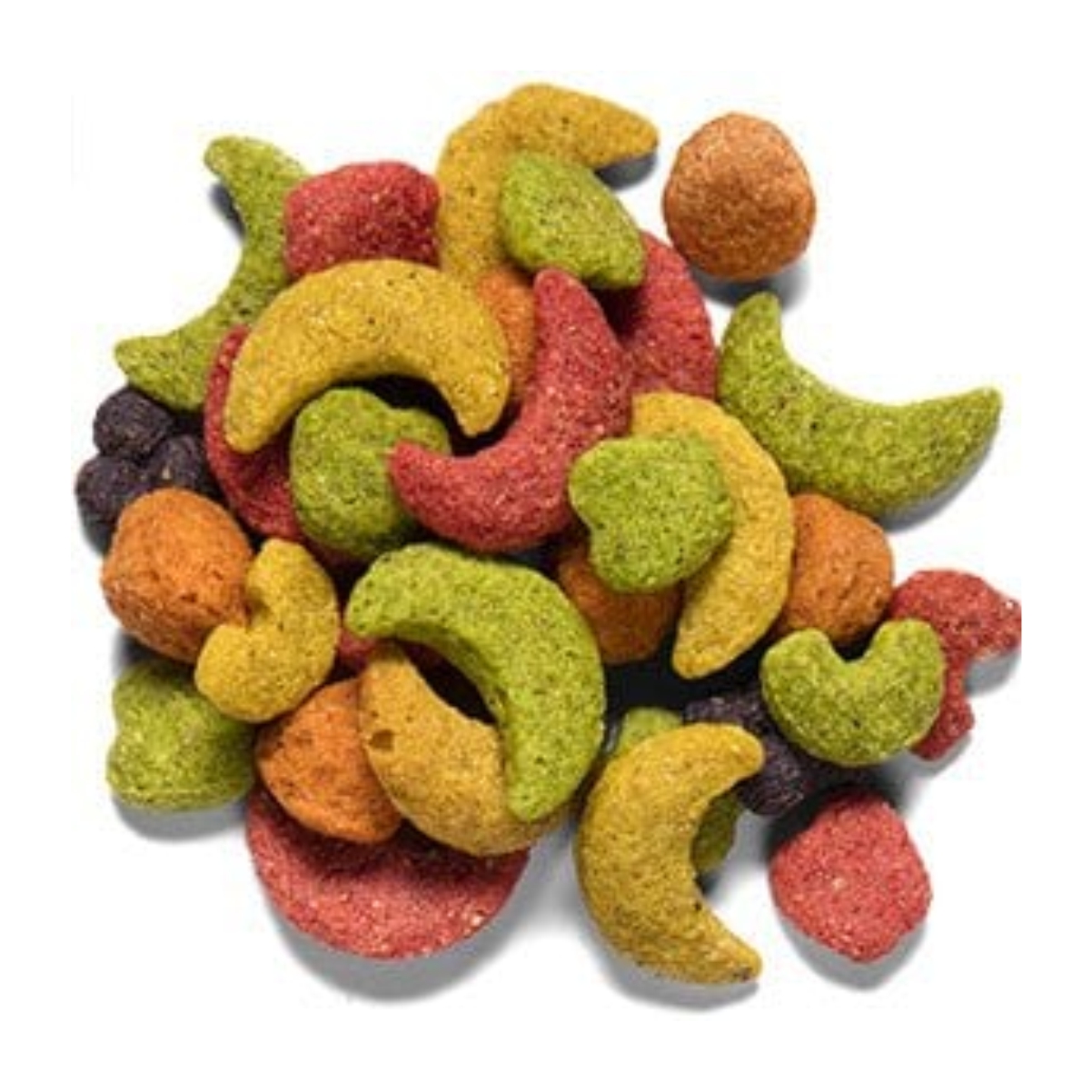 Maíz molido, harina de soya, trigo molido, harina de germen de trigo, azúcar, aceite vegetal (conservado con tocoferoles mixtos), naranjas, manzanas, uvas, plátanos, carbonato de calcio, fosfato dicálcico, sal yodada, sabores naturales, DL-Metionina, cloruro de colina , monoclorhidrato de L-lisina, vitaminas (suplemento de vitamina E, suplemento de niacina, biotina, d-pantotenato de calcio, suplemento de riboflavina, clorhidrato de piridoxina, mononitrato de tiamina, acetato de vitamina A, suplemento de vitamina D3, complejo de bisulfito sódico de menadiona (fuente de actividad de vitamina K) , suplemento de vitamina B12, ácido fólico, ácido cítrico (como conservante), Tocoferoles mixtos (como conservante), Amarillo 5, L-ascorbilo-2-polifosfato, Rojo 40, Amarillo 6, Minerales (Óxido de manganeso, Óxido de zinc, Sulfato de cobre, Sodio selenita, yodato de calcio), azul 1, rojo 3.