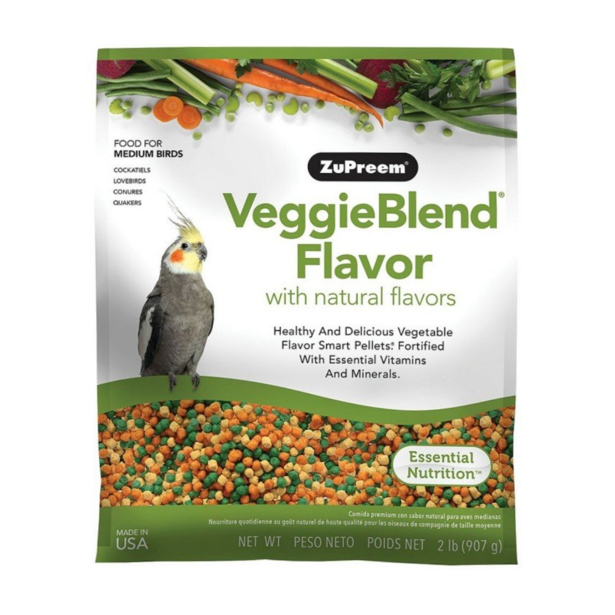 Zupreem VeggieBlend® Flavor Medium Birds brinda una nutrición saludable y deliciosa para la alimentación diaria de aves medianas como ninfas, agapornis, conuros y loros pequeños.